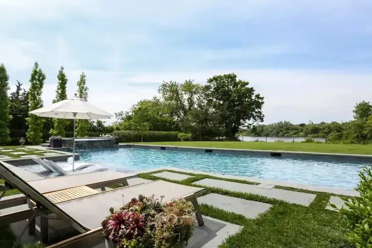 In Southampton, pools usually require a minimum 12-foot setback from side property lines and 15 feet from the rear. Front yard setbacks are determined by the primary building envelope. In East Hampton, side and rear setbacks are typically 10 feet, and front yard setbacks are 20 feet.